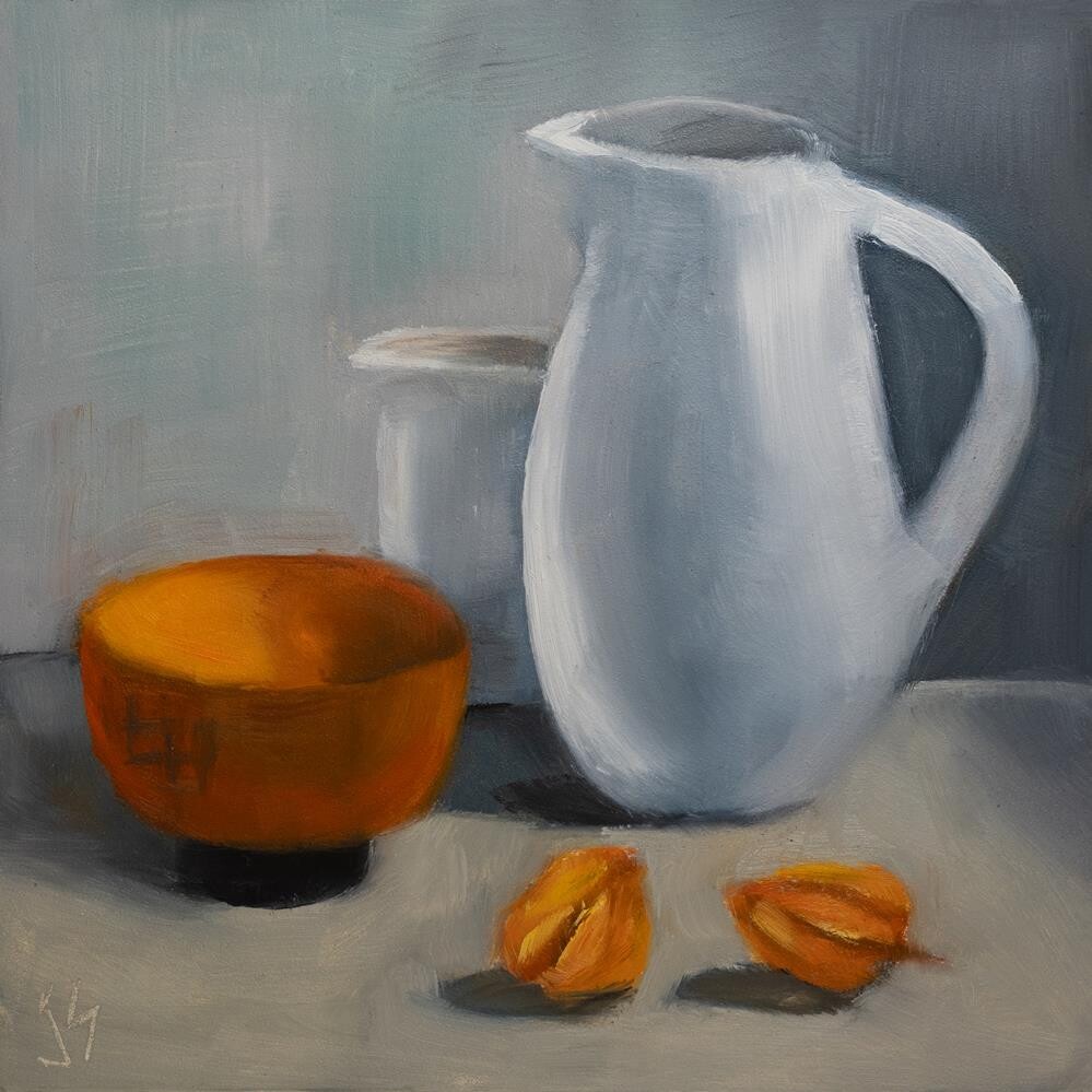 I always love paining from Viacheslav's professional photos. They carry such temperature, interest and calmness. I hope that comes through in the painting. The orange bowl really takes the stage.