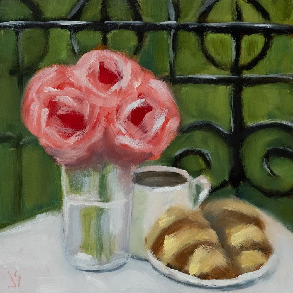 Yet another beautiful morning in Paris - a little slice of privacy yet a bird's eye view of life below. Avenue de la Bourdonnais is near the Eiffel tower and lined with trees so the view from the top floor feels so lush - yet if if you lean over the railing, you can watch people hurrying off to work, running errands, or quite probably - off to see the sights and museums!