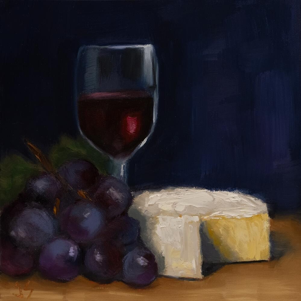 Special evening to enjoy a dark red, ripe cheese, and some big blue grapes.