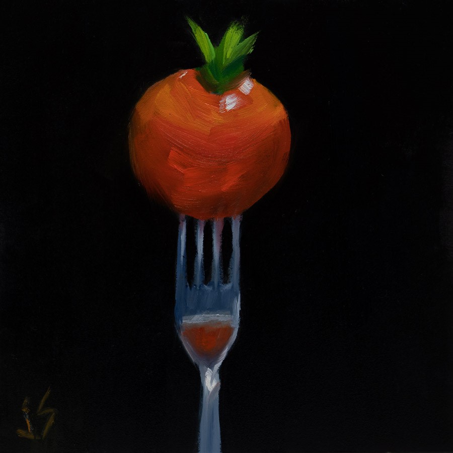 Love painting forks and little bites - some sweet, some savory. I bet this one is right in the middle - late season, plump cherry tomato. Gazpacho anyone? |