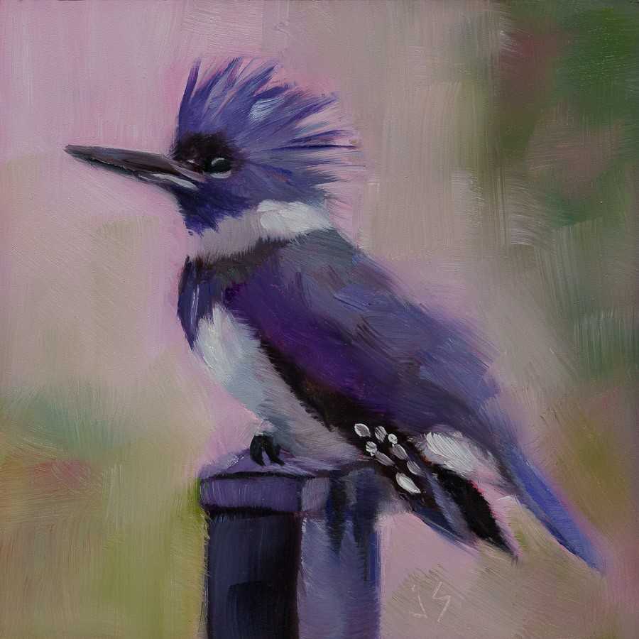 Happy little Belted Kingfisher waiting quietly for his next bite. Not sure what was more fun - painting the bird or the background.