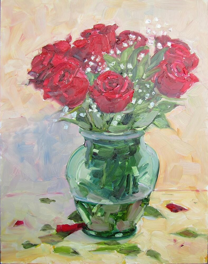 Roses from the market in a pretty green glass vase.