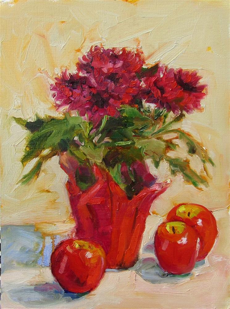 A seasonal painting of bright red Mums and apples from our tree.