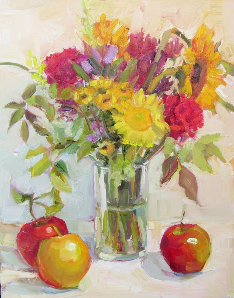 A larger painting with a lovely fall bouquet and fresh picked apples.