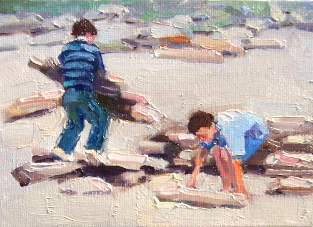 This is a painting of boys having a fun time on the beach with the beach logs.