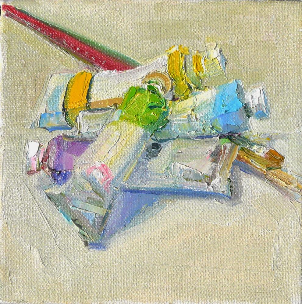 Today's painting of tubes and brushes is softer in color than yesterdays paint tube painting. I used both a brush and palette knife to paint this painting.