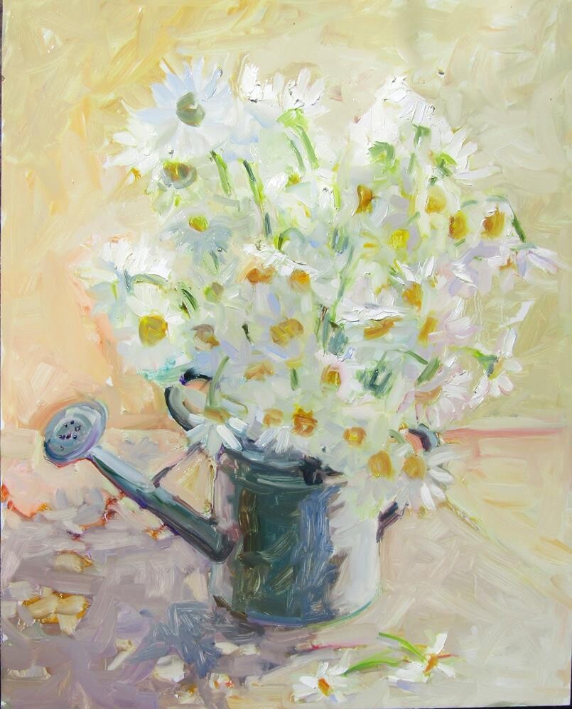 My son had cut back many daisies that were falling on to our walkway.I painted this painting next to the doorway in the sun. The sun moves changing the light and shadow. But I think the painting worked.