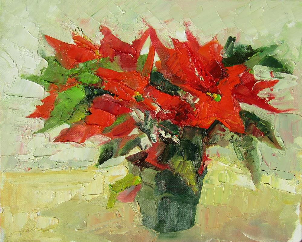 Painting of a Christmas Poinsettia plant with it's bright red flowers.