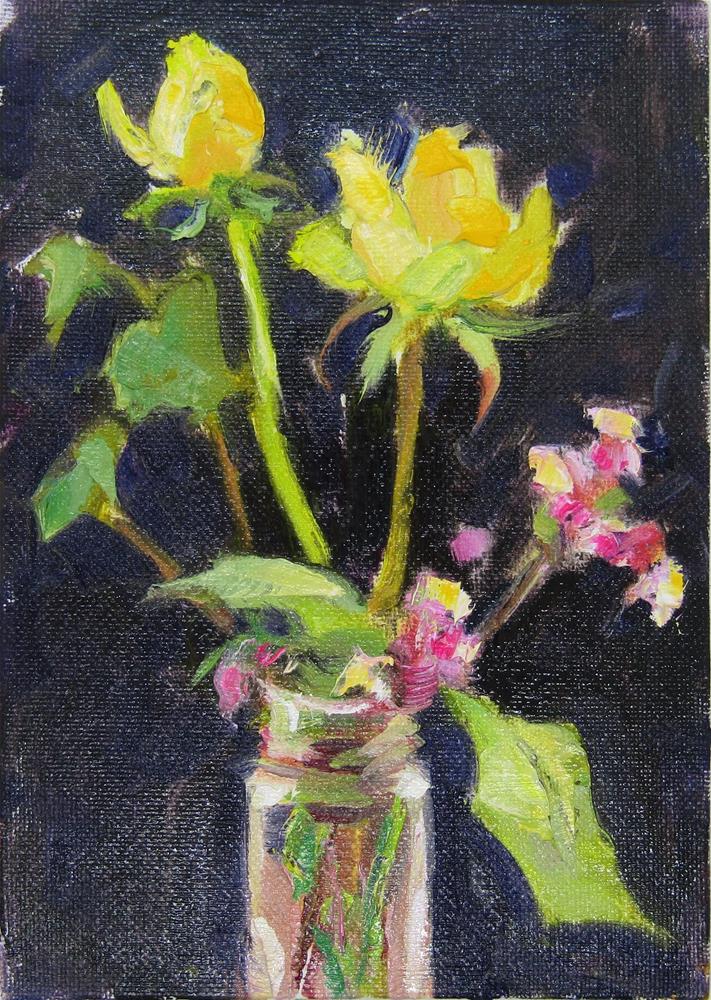 I don't have many paintings with a black backdrop. Not black but a mix of my darkest colors making the yellow roses popped. So I kept the background. These plants and flowers are from my garden.