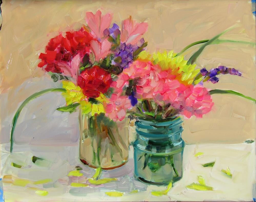 Two pretty jars of mixed fall flowers.