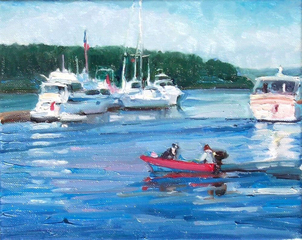 This is a painting of a harbor on one of our Washington State islands. The dog was on way to market.