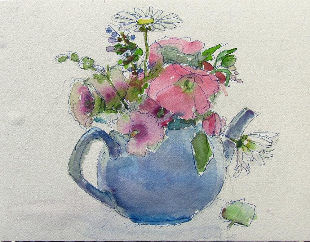 Another painting of teapot and hollyhocks. I didn't wet the paper first for this watercolor. So the colors didn't bleed.