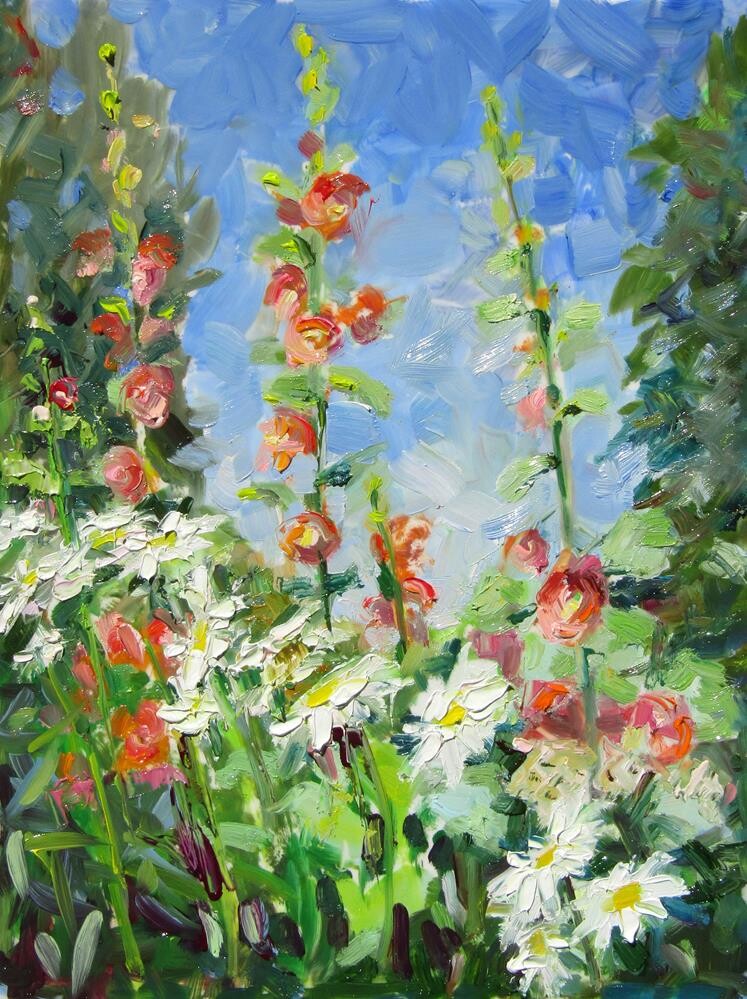 My garden hollyhocks and daisies by my studio.