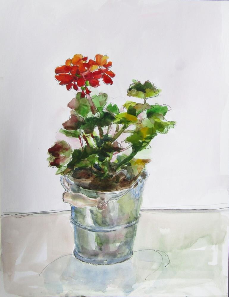 Watercolor painting of a potted Spring geranium.