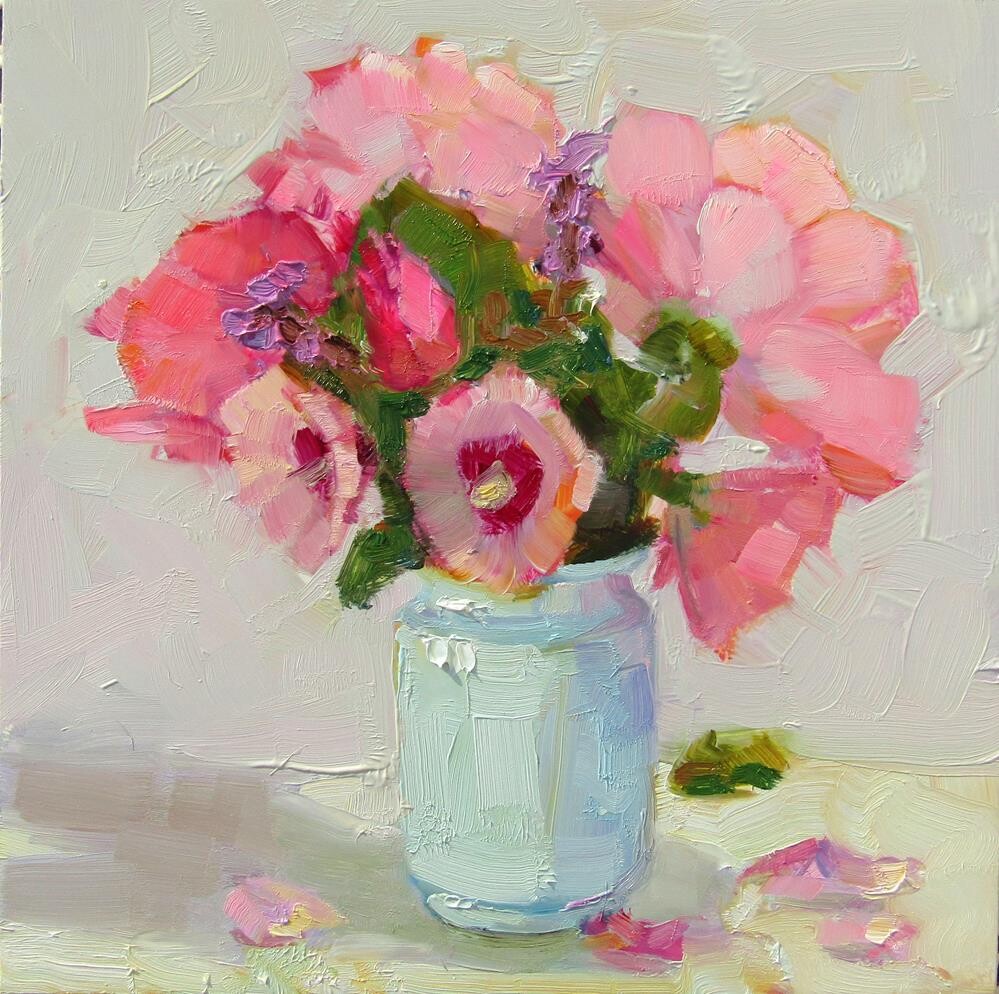 Pretty pink Hollyhocks and pink roses to brighten your day.