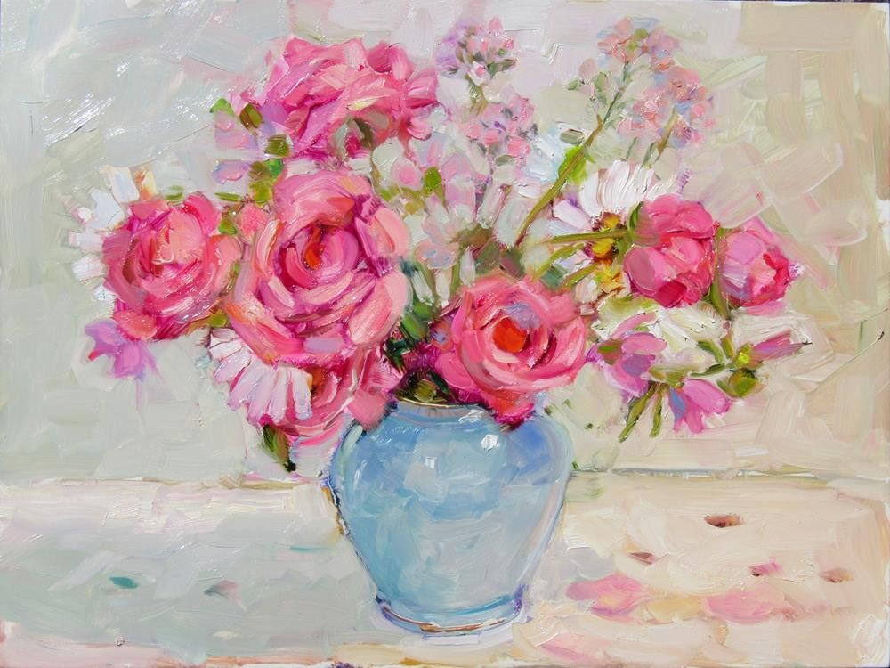 Pretty mixed flowers from my garden in a blue ceramic vase.