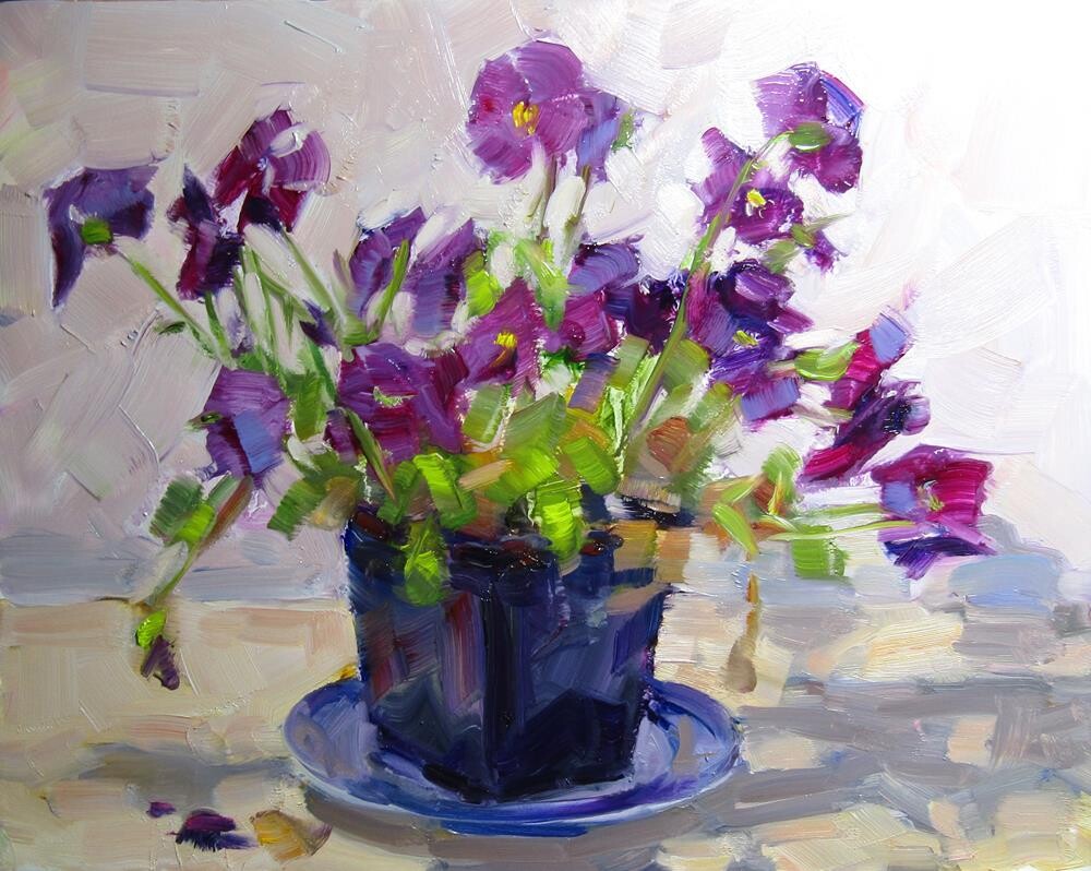 Purple pansies in pot.
