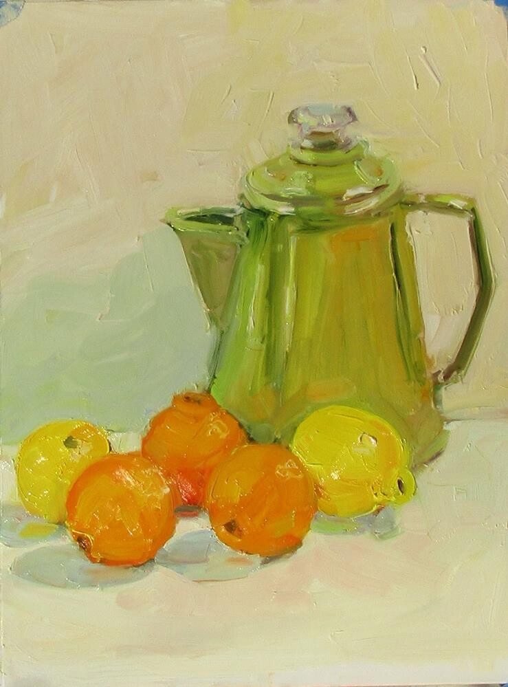 A portrait of my green coffee pot with fruit.