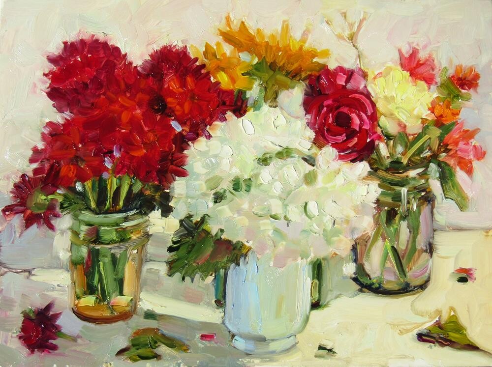 Mixed flowers in little vases and jars.