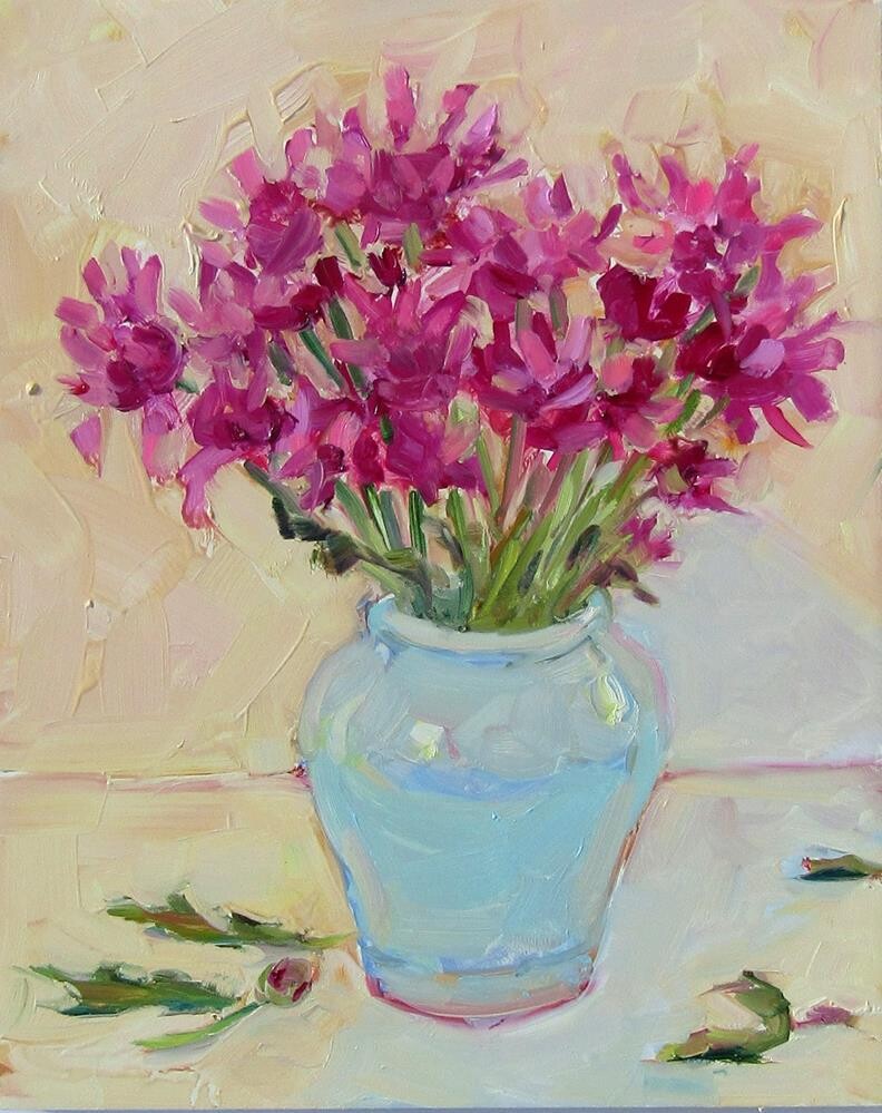 Magenta Mums that I picked up at the market in the morning. I thought they would go well in the blue ceramic vase.