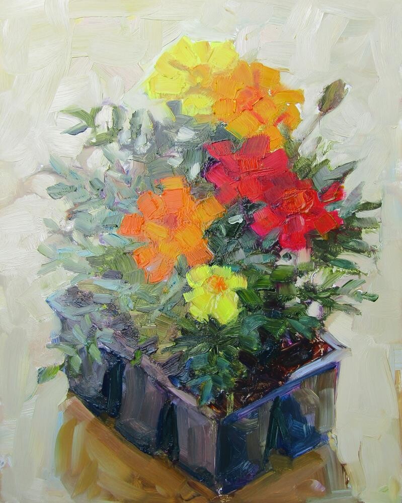 Marigold plants that will go in the garden.