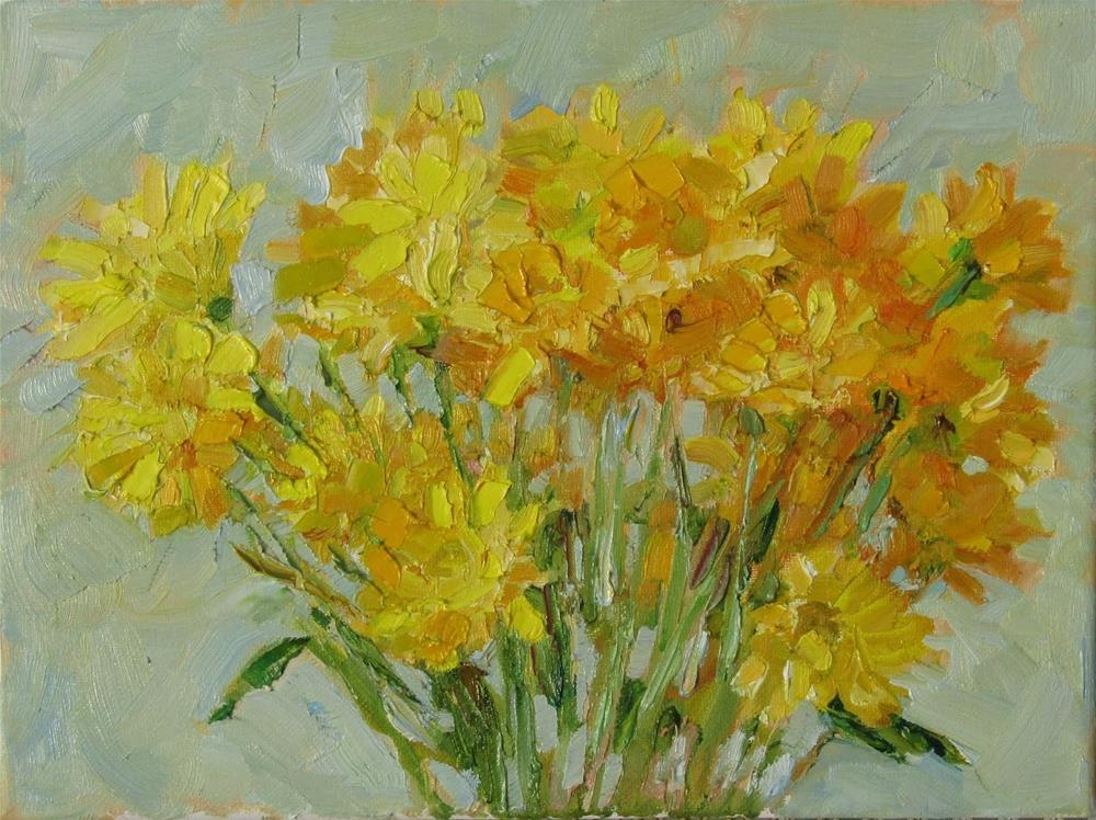 I worked more on this painting from the day before. I gave the still life a gray blue background. It seemed to me that the lemon yellow paint mixed with white looked cool. So I used lemon yellow straight from the tube and that gave the flowers a warmer glow.