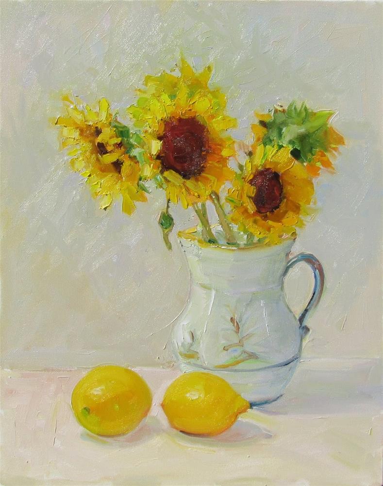 Sunflowers in a Spanish pitcher with lemons. I had to remove some of the yellow paint pulled into the background behind the sunflowers. My paint is very wet so if I touch one color to another it often will mix. The sunflowers are more defined in this image.