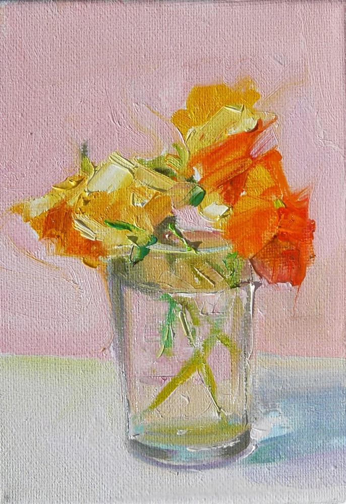 This painting is of cut orange pansies. My pansy plants are fast fading.