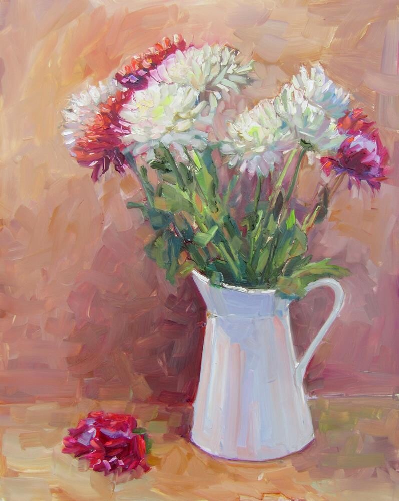 My white porcelain pitcher filled with Chrysanthemums.