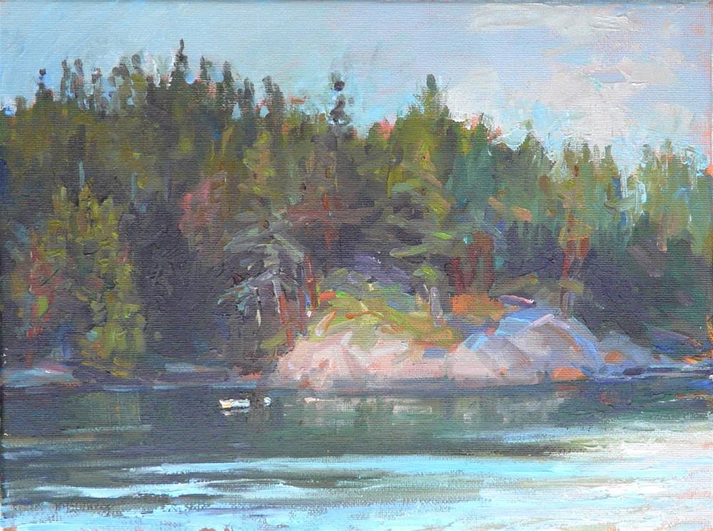 This is a painting of a row boat in a cove of one of the beautiful Washington State Islands.