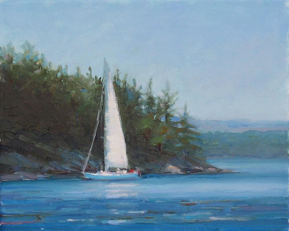 A painting of a sailboat sailing off the Washington State Islands.