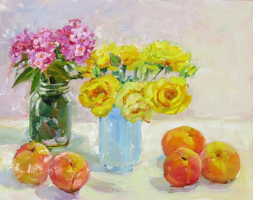 There is a glare from the sun on the image of this painting. The peaches and flowers are from my garden.