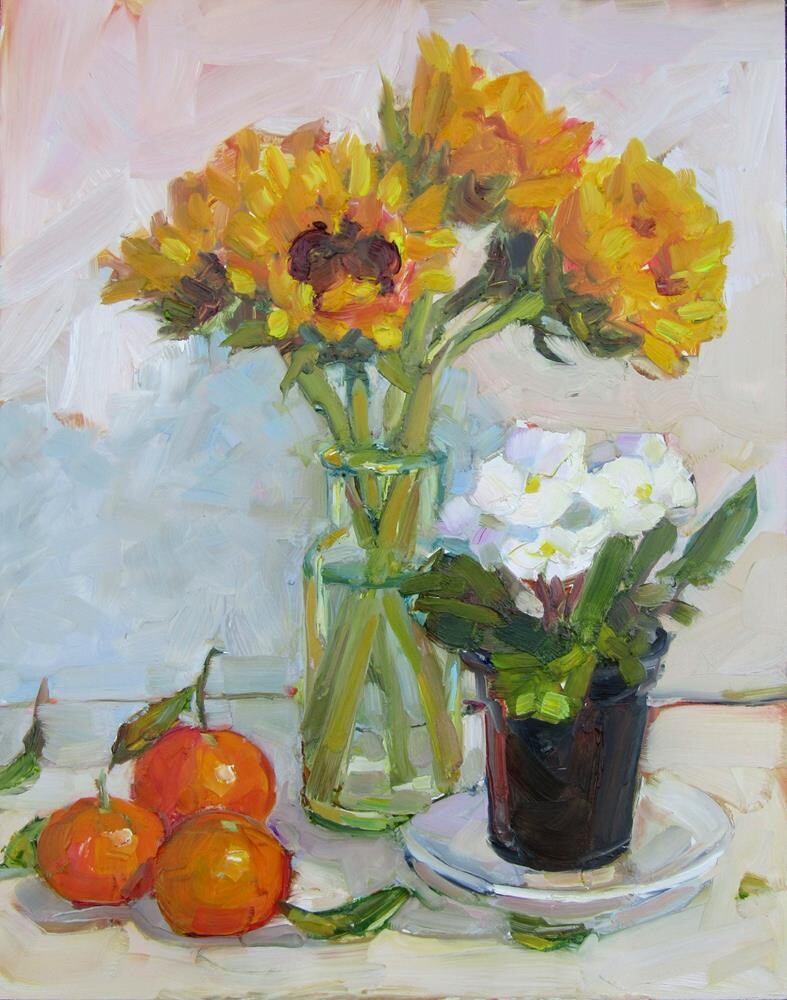 A mix of flowers and fruit.