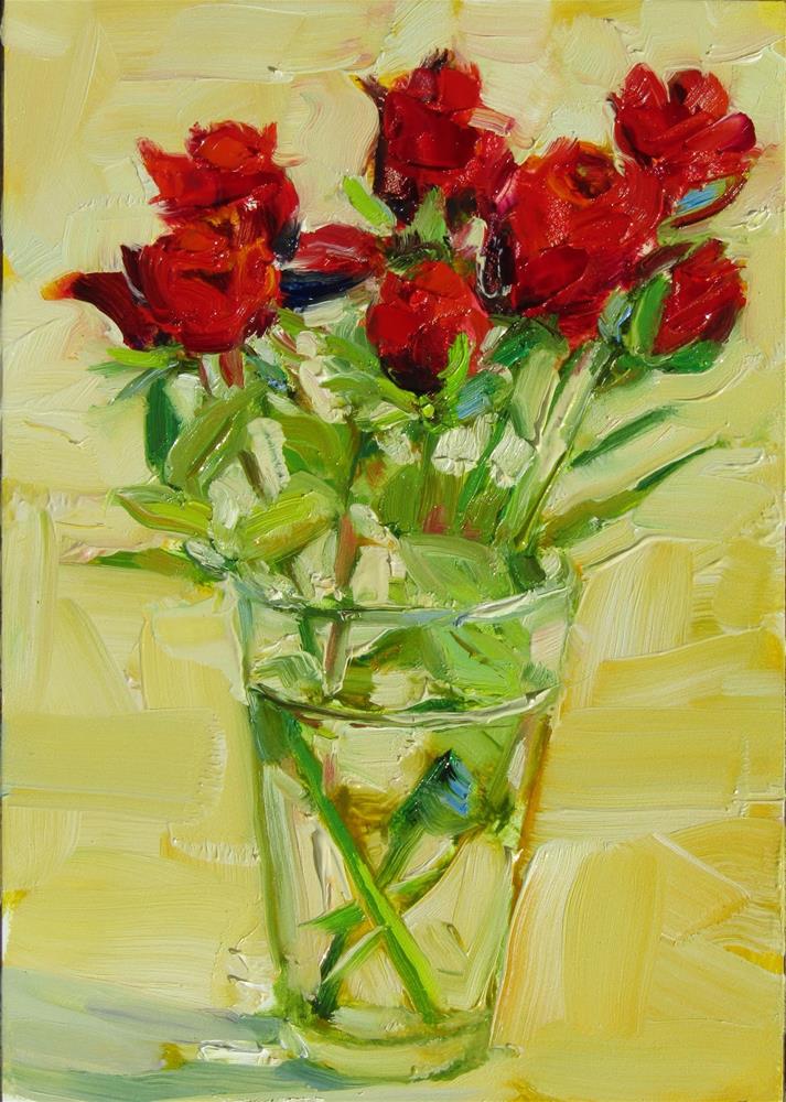 This is a small painting of my small red roses from my garden. The roses may open up bigger in a couple of days. Then I may paint them again.