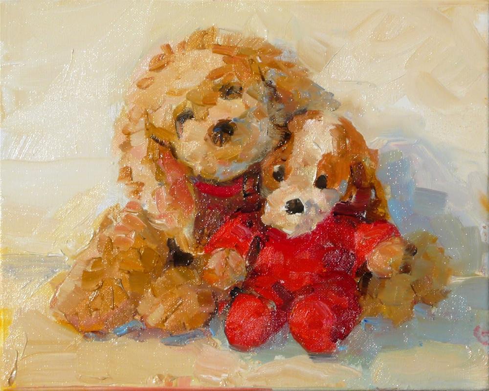 A painting of a couple of soft stuffed doggy toys.