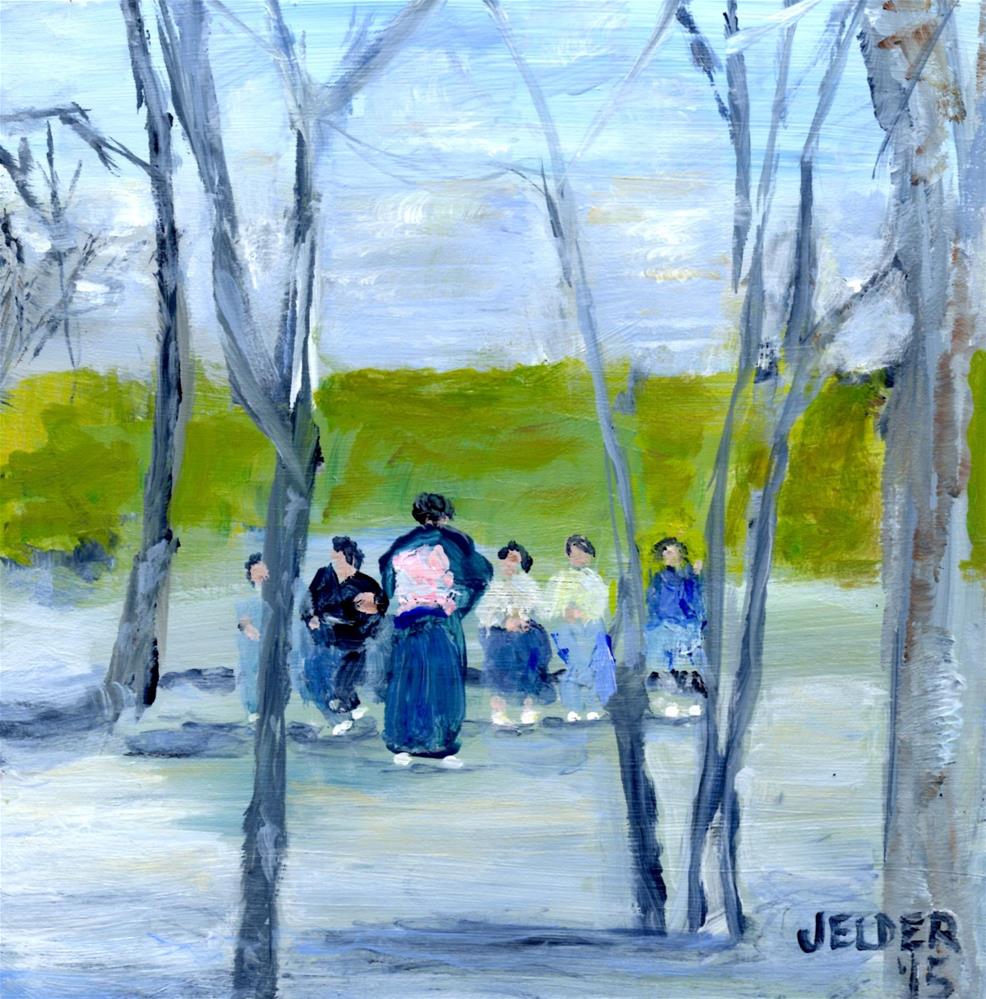 A group of women are hanging out at a park in Tokyo. Painted on 6" x 6" x 1/8" gessobord with acrylic paint and a glossy varnish.
