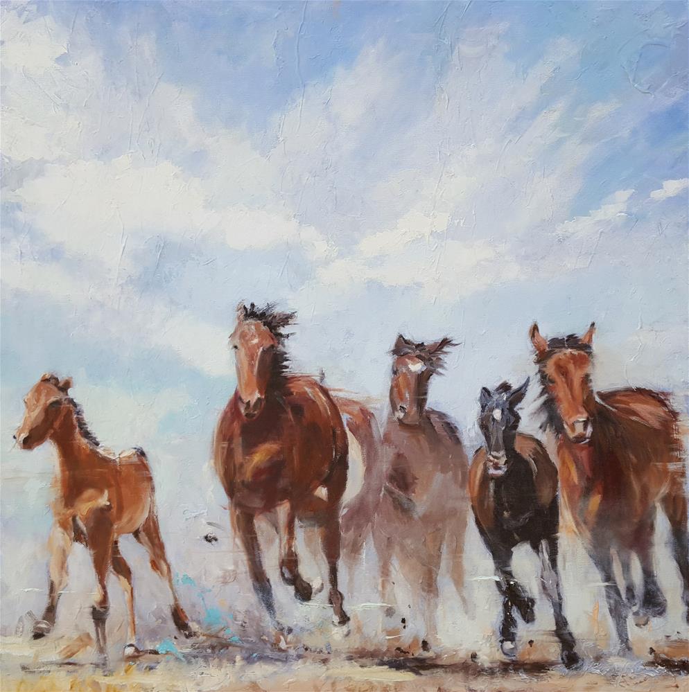 When I painted this painting, I wanted the viewer to experience the thrill of a charging herd of horses. Hopefully you can 'hear' and 'smell' the sounds created by this painting!