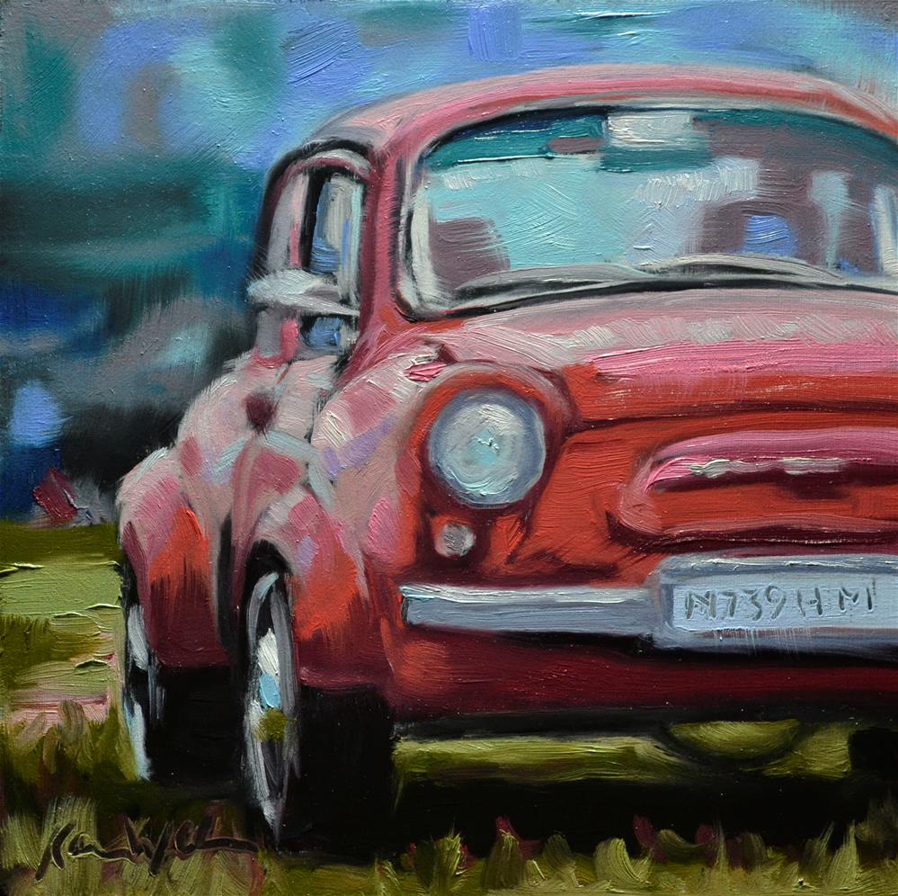 I know...it looks like a VW beetle in a way, but it isn't! I am not sure what kind of car it is, but I think it might be French... Anyway, here is today's painting... Little Red Car, for lack of a better title..If you think you know what kind of car this is, let me know!
