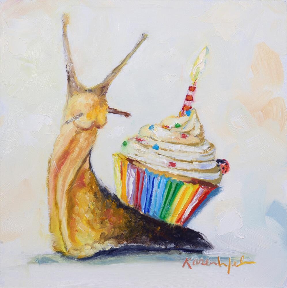 Back during lockdown, things moved slower... It was during this period that I created a series of snail paintings featuring snails with alternative shells. There were some 20 different snails, and this is one of the few that are still living with me... But she is ready for a new home, celebrating along with her companion, lady bug, and a special cupcake, just for you :) I still paint these guys from time to time and also have some of them available as cards and prints on my website www.karenweberfineart.com! Back during lockdown, things moved slower... It was during this period that I created a series of snail paintings featuring snails with alternative shells. There were some 20 different snails, and this is one of the few that are still living with me... But she is ready for a new home, celebrating along with her companion, lady bug, and a special cupcake, just for you :) I still paint these guys from time to time and also have some of them available as cards and prints on my website www.karenweberfineart.com! |