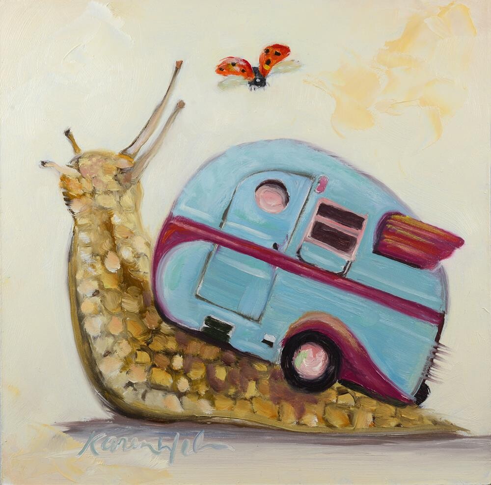 Back during lockdown, things moved slower... It was during this period that I created a series of snail paintings featuring snails with alternative shells. There were some 20 different snails, and this is one of the few that are still living with me... But she is ready for a new home, travelling with her companion, lady bug, with her travel digs on her back :) I still paint these guys from time to time and have some of them available as cards and prints on my website www.karenweberfineart.com Back during lockdown, things moved slower... It was during this period that I created a series of snail paintings featuring snails with alternative shells. There were some 20 different snails, and this is one of the few that are still living with me... But she is ready for a new home, travelling with her companion, lady bug, with her travel digs on her back :) I still paint these guys from time to time and have some of them available as cards and prints on my website www.karenweberfineart.com |
