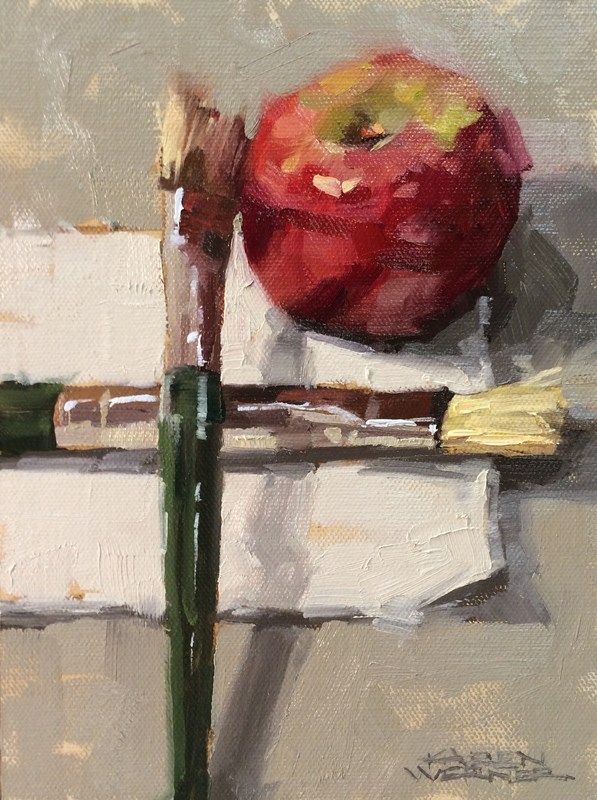 Painted from life in the studio. This Bible verse which is a prayer, came to mind: "Keep me as the apple of your eye. Hide me in the shadow of your wings." Psalm 17:8 I often use a cruciform design for still life arrangements. This time I deliberately formed a cross with the brushes.