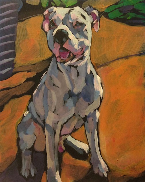 I think this has already been given to the recipients, and so I am hopefully safe in posting it today- I loved the color on this sweet dog's sleek white coat! And that grin! It was one of those commissions where my lovely patron sent me several photos, and then sent this one explaining that it is the couple's favorite of their pet. When I see the photo that I know will work, I can feel it- if I'm scanning through a number of photos, there will always be at least one that I pause at and have one of those "wow! That's PERFECT" reactions, and I know I can paint it!