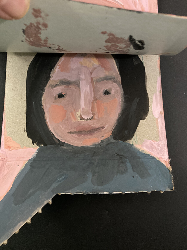 Two paintings in one. Flip the top up to see the woman painting underneath. Gouache portrait painting on torn cardboard. Two paintings in one. Flip the top up to see the woman painting underneath. Gouache portrait painting on torn cardboard. |