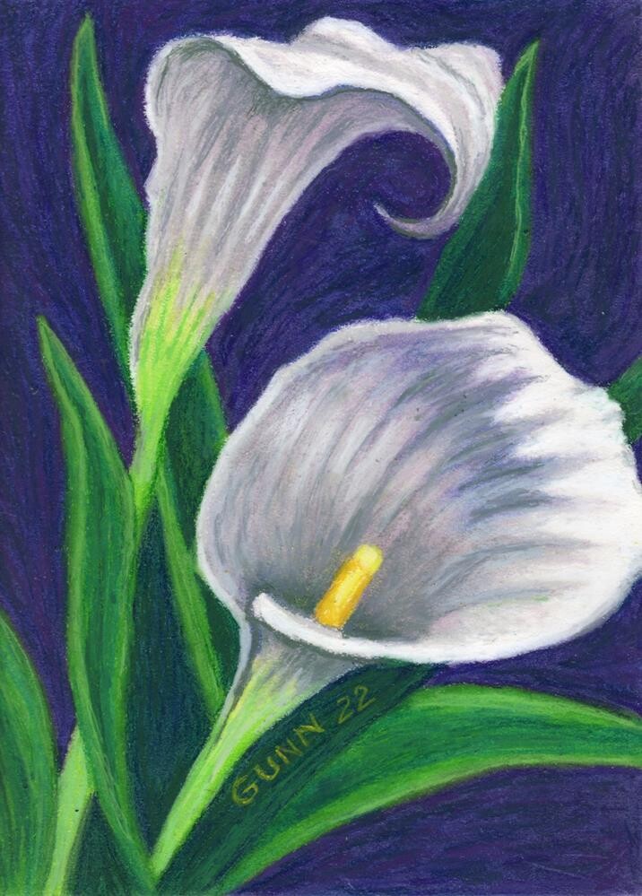 Two white calla lilies rendered in oil pastel on a dark background with green leaves around them. Two white calla lilies rendered in oil pastel on a dark background with green leaves around them. |