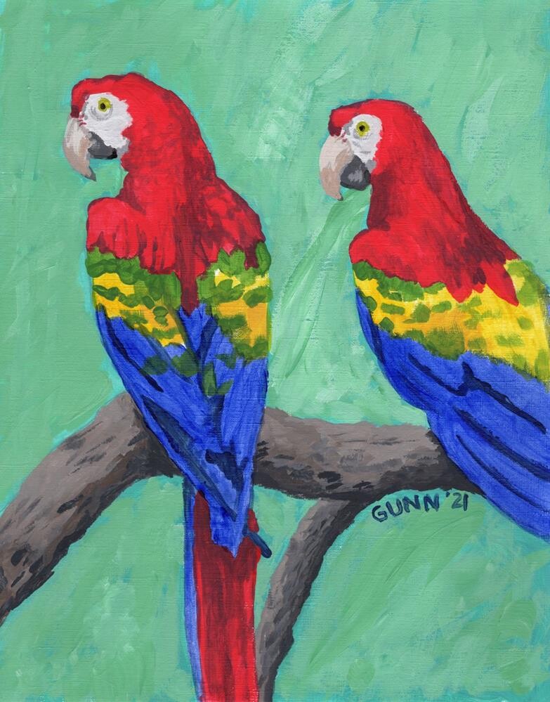 A pair of scarlet macaws perched on a tree limb with a blue-green background, showing off their rainbow of colored feathers. An acrylic sketch on primed paper to test the composition, just signifcantly larger than a traditional thumbnail sketch. A pair of scarlet macaws perched on a tree limb with a blue-green background, showing off their rainbow of colored feathers. An acrylic sketch on primed paper to test the composition, just signifcantly larger than a traditional thumbnail sketch. |