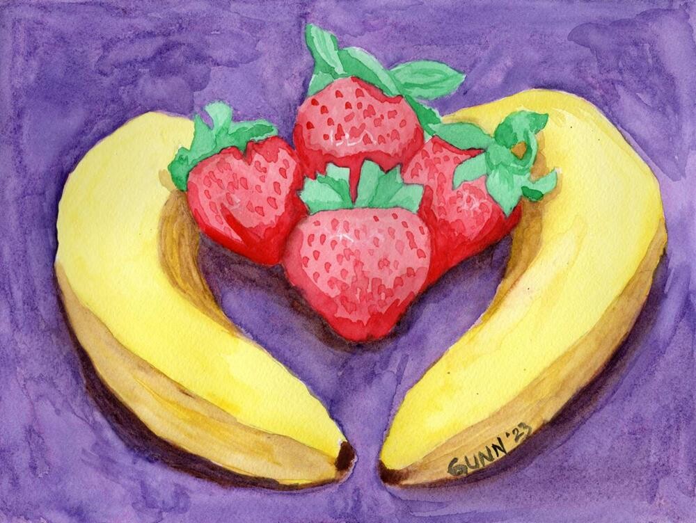 A watercolor study of fruit in a still life arrangement, with two bananas around four strawberries at an angle that gives a vague heart shape to this artist's eye. |