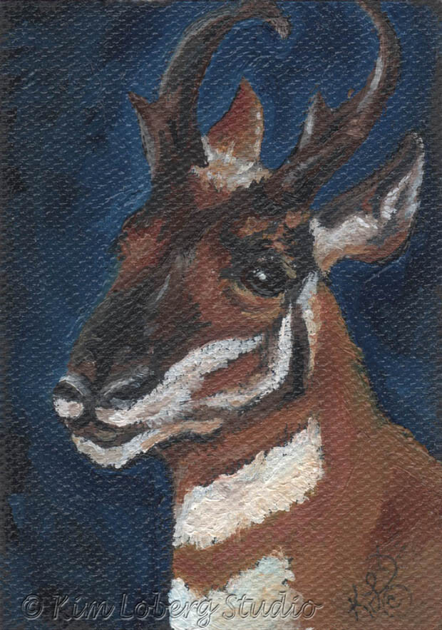 This pronghorn ACEO artwork is done in oils, so it has taken a long time to paint. It's finally dry and is ready for a new home! This pronghorn ACEO artwork is done in oils, so it has taken a long time to paint. It's finally dry and is ready for a new home! |