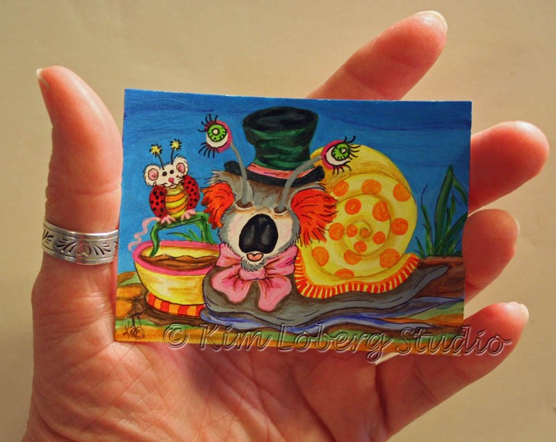 "Tea Time" Mad Hatter & Lady Bug Door Mouse - is my entry for ACEO madness99. I started this piece on Feb. 20th while my furnace was being replaced. (Guess the 34 degree temp kicked in the creative juices). When I tried to combine the Mad Hatter theme with my crazy creatures, a Koala snail and Door Mouse ladybug was the only thing that popped into my head. After over 2 weeks of work, my painting is complete and ready for a new home! "Tea Time" Mad Hatter & Lady Bug Door Mouse - is my entry for ACEO madness99. I started this piece on Feb. 20th while my furnace was being replaced. (Guess the 34 degree temp kicked in the creative juices). When I tried to combine the Mad Hatter theme with my crazy creatures, a Koala snail and Door Mouse ladybug was the only thing that popped into my head. After over 2 weeks of work, my painting is complete and ready for a new home! |