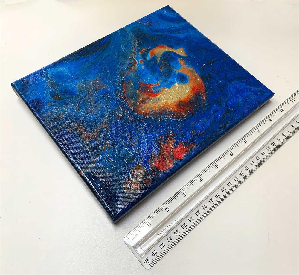 Story: On November 8, 2018 the Camp Fire destroyed our home, offices, my art studio and all my art that was still in stock, over 175 pieces. In 2019 I had the opportunity to go to a studio and do some paint pouring. It was a wonderful way to be creative, have fun, and not think about the losses. As of this writing, it is July 2020, I have a new studio and am starting to create art again. This is a poured acrylic painting. The gold paint emerged from the blue. It looks like a goldfish being chased by a larger creature. To me it looks like it could be underwater or far out in space.