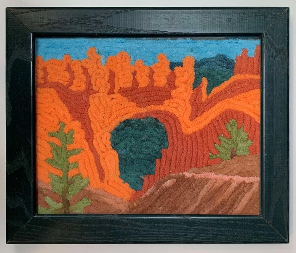 Bryce Canyon National Park is full of amazing, fantastic hoodoo shapes. Natural Bridge is one of the main viewpoints from the park drive. I looked through my yarn stash and chose these vibrant colors to create an impression of the arch. (I use my own photographs as references) I use the yarn to describe the direction of a shape or to depict the texture. Everything in the painting is deliberate yet, because yarn is such an unique medium, I must work with its intrinsic limitations, which is a fun challenge. Art is framed behind glass and ready to hang. Bryce Canyon National Park is full of amazing, fantastic hoodoo shapes. Natural Bridge is one of the main viewpoints from the park drive. I looked through my yarn stash and chose these vibrant colors to create an impression of the arch. (I use my own photographs as references) I use the yarn to describe the direction of a shape or to depict the texture. Everything in the painting is deliberate yet, because yarn is such an unique medium, I must work with its intrinsic limitations, which is a fun challenge. Art is framed behind glass and ready to hang. |